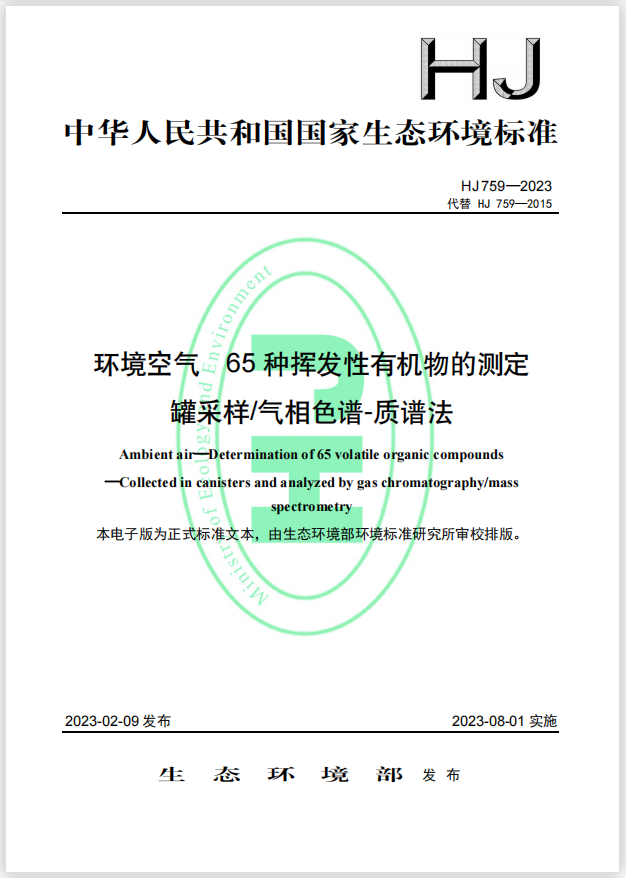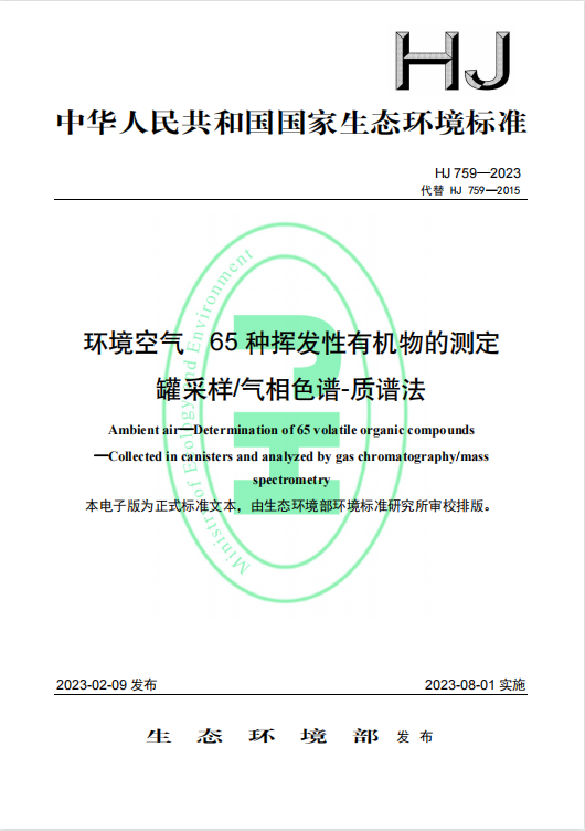 HJ 759—2023环境空气 65 种挥发性有机物的测定 罐采样 气相色谱-质谱法 HJ 759—2023环境空气 65 种挥发性有机物的测定 罐采样 气相色谱-质谱法 更新日期:2023-03-15 下载包(1)